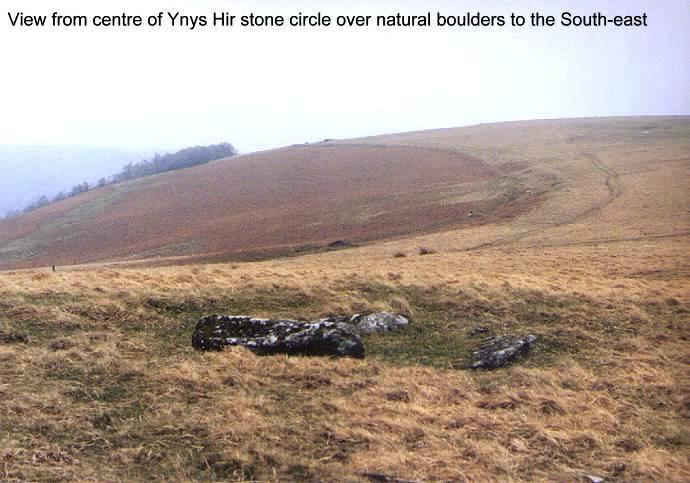 The lonely circle at Ynys Hir (SN 921 383) on Mynydd Eppynt (now within a military training area) is an interesting circle with an apparently natural group of boulders occupying a wide gap at its South-eastern edge. Another wide gap occurs at the West of the circle. After excavation in 1940 the excavator thought that the most likely reason for the placement of these entrances was to accomodate two prehistoric trackways which intersected a short distance away from it (Dunning 1943, 178). One of the tracks was orientated East-West, and the entrances to the circle were similarly arranged, allowing easier access to the circle. However, when considering the deliberate inclusion of the natural boulders in the circle, he stated that "the long gap [at the South-east of the circle] suggests that the group [of boulders] was, for some reason or other, intentionally incorporated in the plan of the monument" (ibid., 177). The Royal Commission's recent inventory of the region states that these "glacial erratics were probably left there because they were too heavy to move" (RCAHMW 1997, 157). Could astronomy help to explain the inclusion of these stones? Although the centre-point of the boulders, when viewed from the centre of the circle, indicates sunrise in late November and mid January, the arc spanned by the boulders also takes in the midwinter rising Sun - which may have been the builders' intended target.