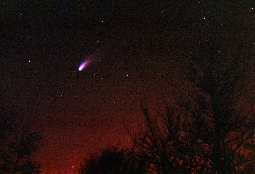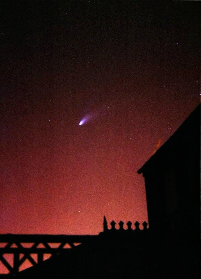 Comet Hale-Bopp from the City Another view of Comet Hale-Bopp, taken from the city of Cardiff, UK on 31st March 1997. The extent of sky glow from the street lights of the nearby housing estate can clearly be seen. Despite the light pollution, it is possible to detect the two tails of the comet in this picture. The dust tail is the most obvious, curving slightly towards the upper right, and there is a much fainter, bluish-coloured gas tail, facing upwards at a much steeper angle. The picture was taken just 7 hours ahead of the comet's closest approach to the Sun (known as the perihelion).