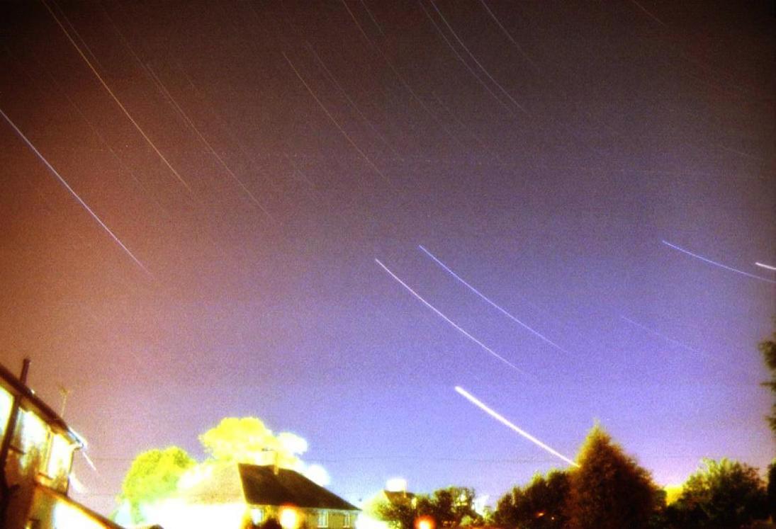 Approximately two-thirds up the picture, a series of faint dots can be seen horizontally across the picture. These were strobe lights from an aircraft which crossed the field of view during the exposure time.