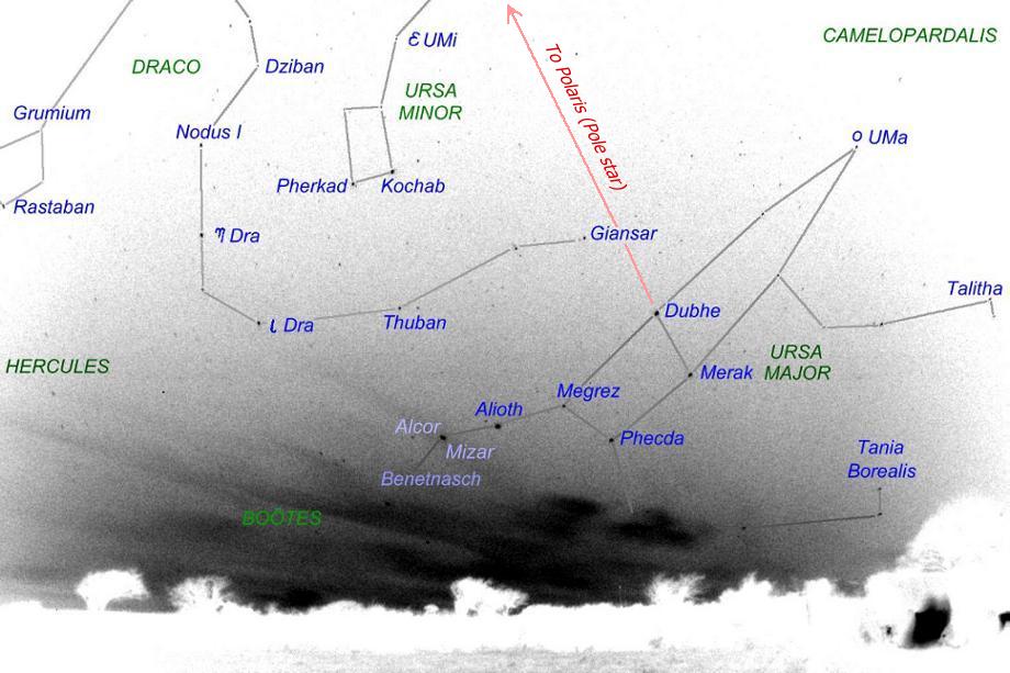 Ursa Major & its Northerly Neighbours The picture was taken looking Northwards from a rural location in West Wales in November 1999, at around 2130 UT. Ursa Major (The Great Bear, which contains the seven-star asterism commonly known as The Plough or The Big Dipper) is seen low down in the sky along with its much less prominent neighbours Draco, Lynx, Camelopardalis and Ursa Minor.