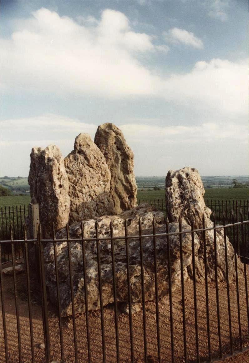 One-and-a-half miles (2½ km) West of Great Rollright village, enclosed within an ugly iron railing, are the crude remains of the Whispering Knights burial chamber. It has four upright stones which stand between 5 ft (1.5 m) and 8 ft (2.5 m) tall, and a fallen capstone. The chamber is thought to date from the early Neolithic period, around 4100 BC.