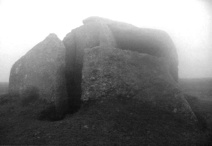 Two giant portal slabs restrict the entrance to an antechamber whilst access to the main chamber is only possible through a narrow gap at the South-western corner. The rear supporting upright has fallen inwards causing the capstone to slide backwards and sideways.