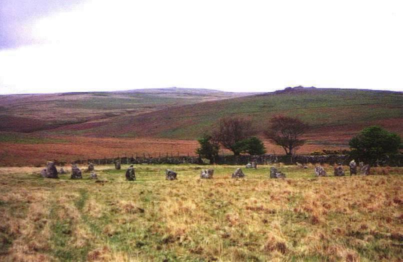 Situated on Ringmoor Down at the South-west corner of Dartmoor, this restored circle is 41 ft (12.5 m) in diameter with a robbed cairn at its centre. Its most impressive feature is a stone row which leads from the circle on a bearing of ca. 10 degrees East of North. The row is a substantial 1740 ft (530 m) in length, comprising small to medium-sized stones, with a tall terminal stone at its Northern end. Although it is now mainly a single row of stones, it may originally have been a double row.