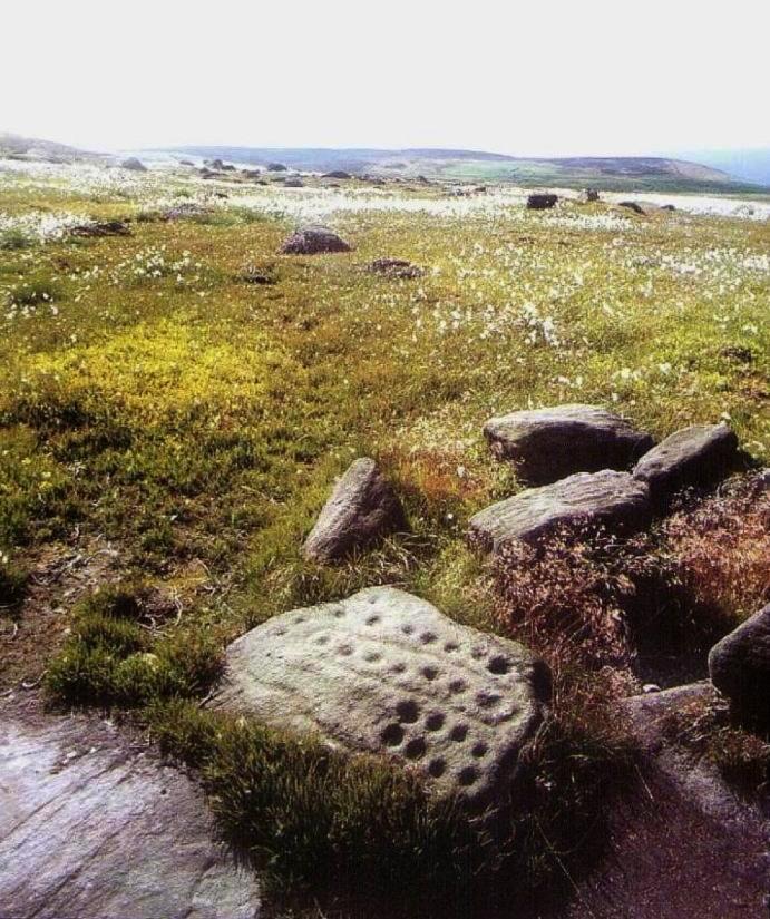 On Green Crag Slack, at the North-eastern corner of Rombalds Moor, is a small, smooth grit rock called the Idol Stone. It has 25 cupmarks, eight of them grouped together and seven of them surrounded by a groove. A single groove runs around the perimeter of the rock. The carvings are remarkably organised when compared to other carved stones on the moor.