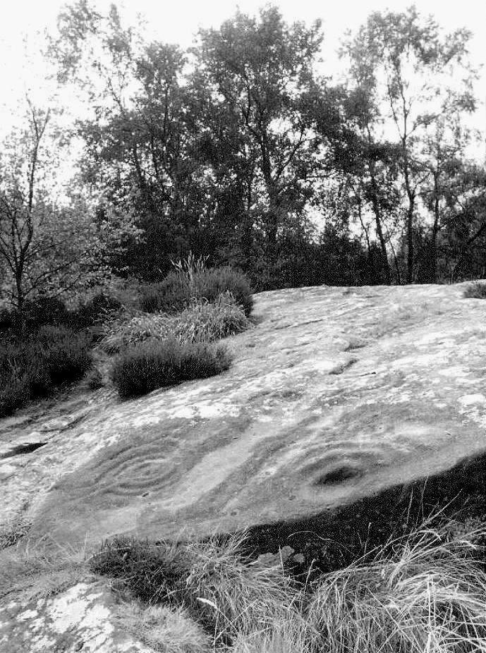 Situated in a clearing amid gorse and silver birch trees, this sloping rock measures some 59 ft (18 m) long and 39 ft (12 m) wide, making it the largest carved rock in Britain.