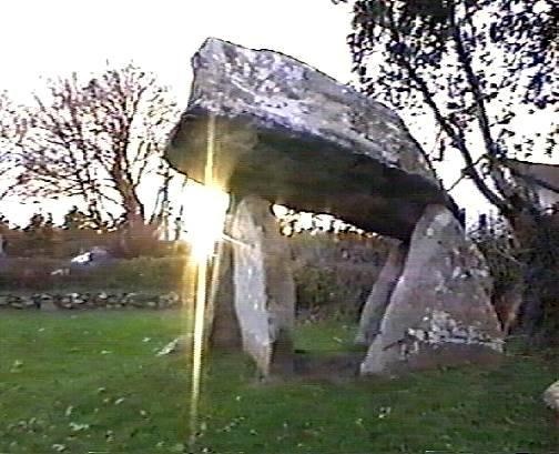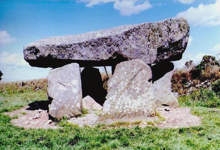 Three orthostats standing 4 ft (1.2 m) tall support a wedge-shaped capstone 10 ft (3 m) long, 6½ ft (2 m) wide and ca.4 ft (1.2 m) thick. A fourth stone lies prostrate nearby, which may originally have been a fourth upright, according to a 1693 account of the site. The chamber is orientated just to the South of East.