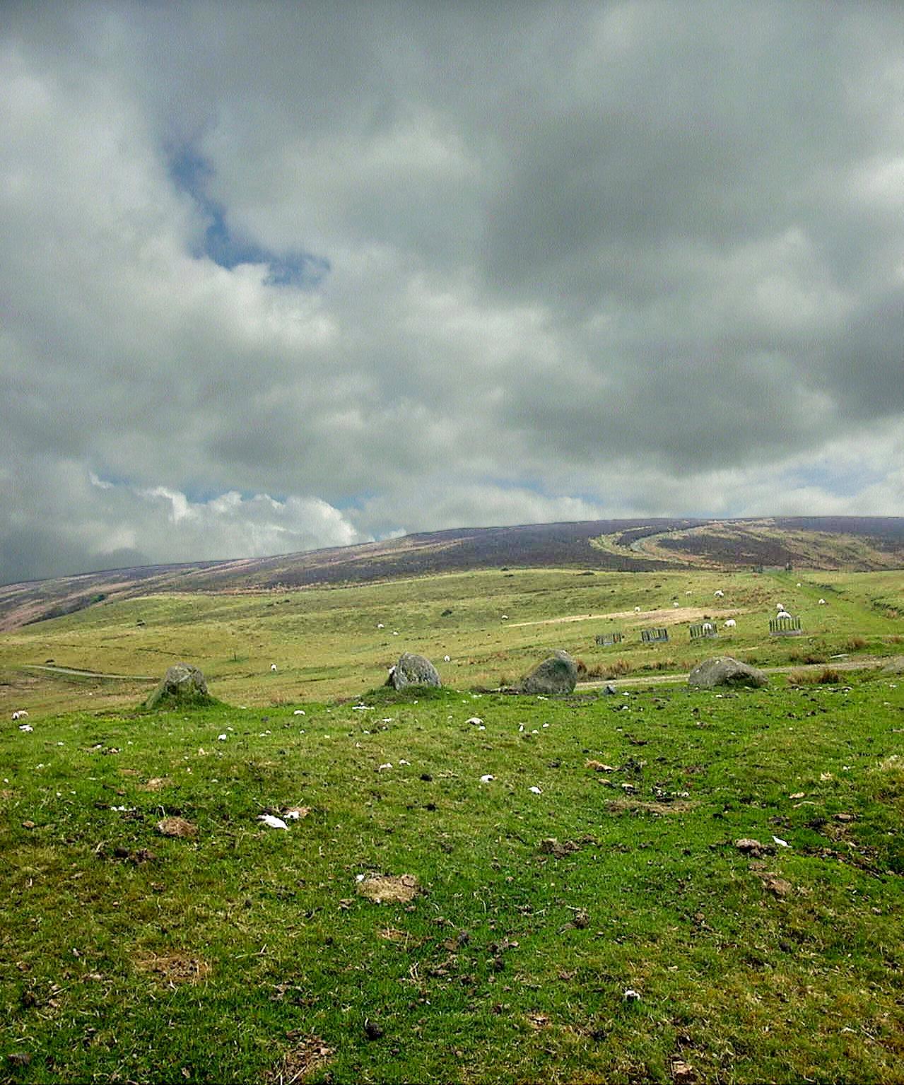 Situated on a low saddle overlooking Conway Bay, this embanked stone circle is 85 ft (26 m) in diameter and originally comprised thirty stones, but only ten are now standing. There is a gap in the circle at the WSW, which is flanked by two large portal stones.
